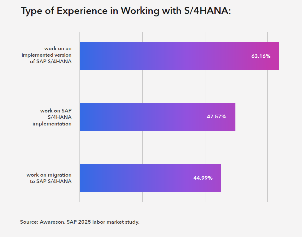 However, expertise varies considerably – from training and certifications through to full-scale migration projects. The largest group report experience of working with an already implemented version of S/4HANA (63%). This shows that a significant share of specialists are familiar with the system mainly from an operational perspective – maintaining processes, supporting users, and managing enhancements. Fewer have taken part in implementation projects (47.6%) or migrations (45%).