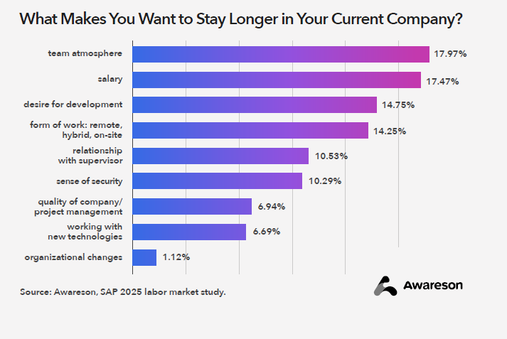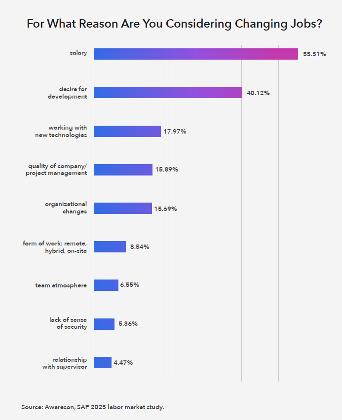 The most common reasons for changing jobs are salary (55.5%) and the desire for professional development (40%). What retains specialists within an organisation is primarily a good atmosphere, competitive remuneration, and opportunities for skill growth. S/4HANA projects – especially full implementations and migrations – can address these needs, provided they offer real influence on solutions and clear prospects for development.
