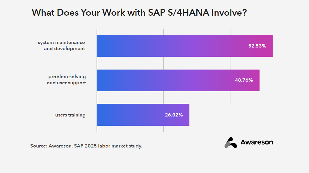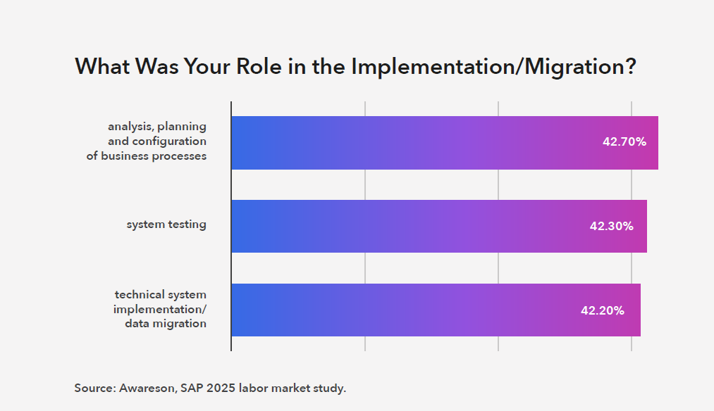 Looking at roles within implementation and migration projects, responses reveal a consistent competency profile. Most professionals were involved in business process analysis and configuration (42.7%), solution testing (42.3%), and technical activities – particularly data implementation and migration (42.2%). On a daily basis, SAP specialists are most frequently engaged in system maintenance and development (52.5%) and user support (48.8%).
