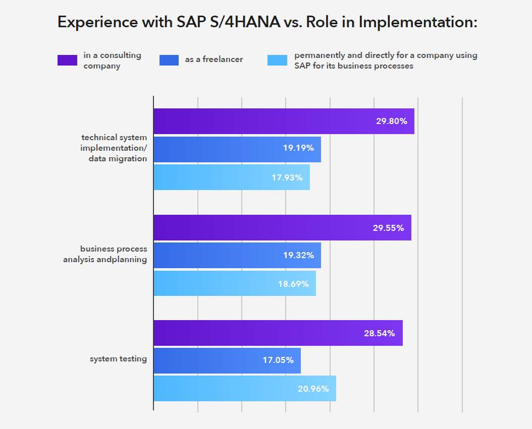 The strongest S/4HANA expertise is found among project-based consultants – freelancers and specialists working with consulting firms. Professionals employed directly by end clients also participate in projects, though typically with a narrower scope and limited to specific phases.