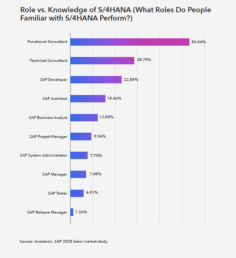 The highest levels of S/4HANA expertise are found among SAP architects (88.6%), technical consultants (81.1%), and developers (79.7%). For these groups, familiarity with S/4HANA is intrinsic to the nature of their work – designing solutions, building extensions, and integrating systems. For them, S/4HANA knowledge is a prerequisite for effective performance.