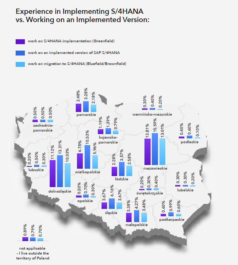The vast majority of SAP specialists are based in the Mazowieckie, Dolnośląskie and Wielkopolskie regions – where both implementation projects and client infrastructures are concentrated. Unsurprisingly, this is also where the highest number of S/4HANA experts are located.