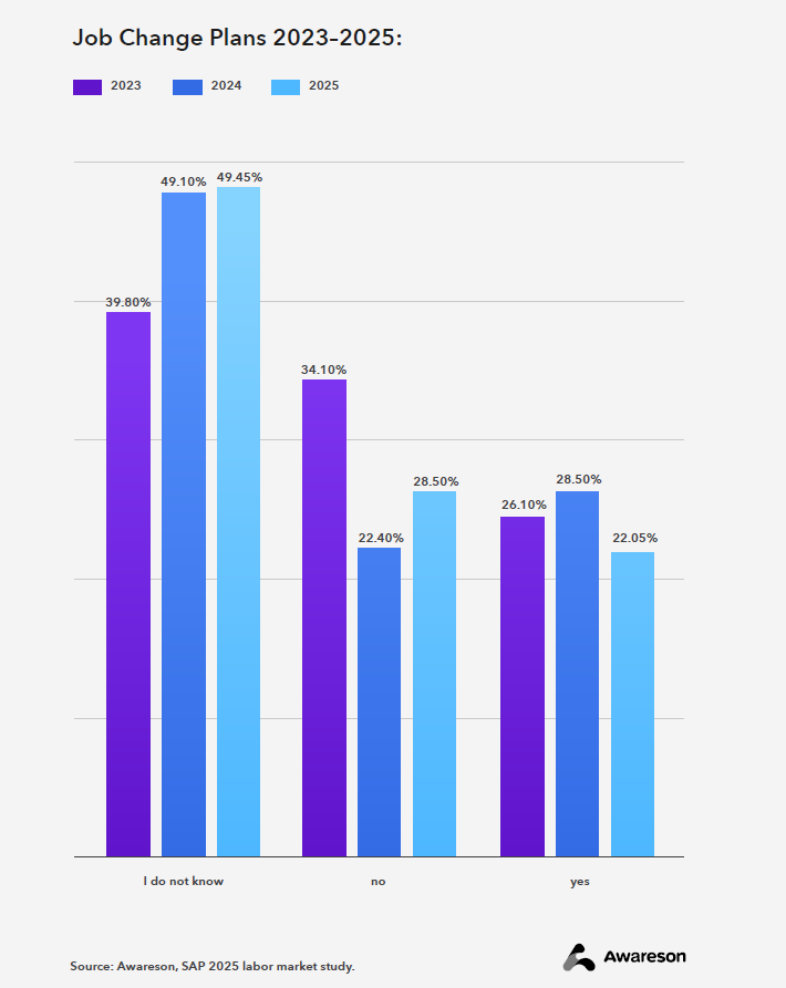 When expanding internal teams with permanently employed specialists (either on employment contracts or B2B arrangements), it is crucial to account for the exceptionally low turnover among SAP professionals. Only 22% declare an intention to change jobs – significantly lower than the IT industry average, where turnover exceeds 30%. For comparison, Gallup data indicates that 52% of employees globally and 31% in Europe are considering a job move.