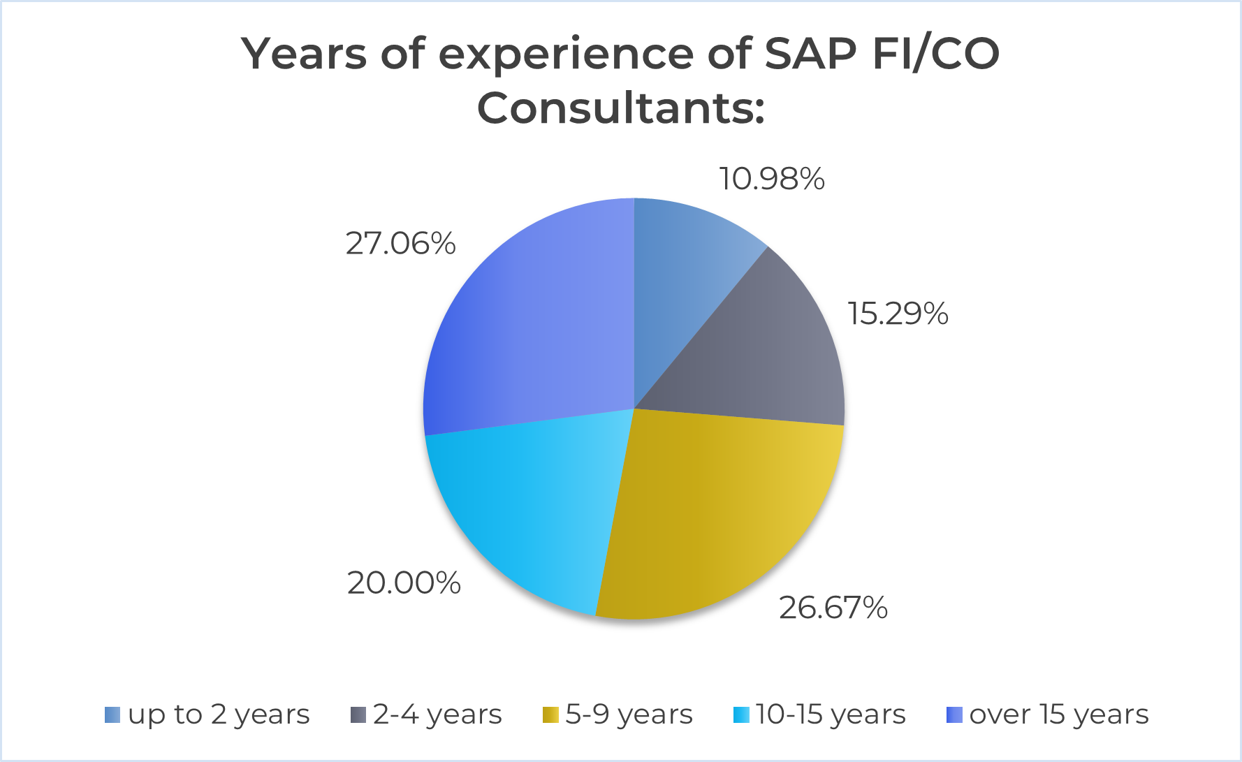 SAP FI/CO specialists are one of the most experienced groups in the entire SAP ecosystem. Statistically, they have longer professional experience than consultants for other modules. There are slightly fewer people with less than two years of experience (approx. 11%) than in the entire SAP community (nearly 13%). Similarly, specialists with 2-4 years of experience account for 15% compared to 21% overall.