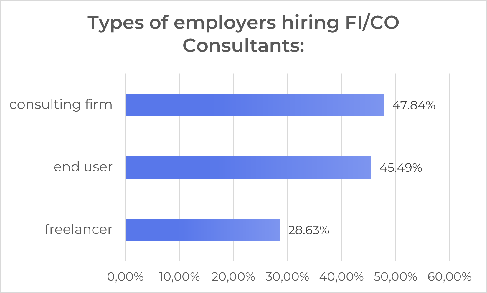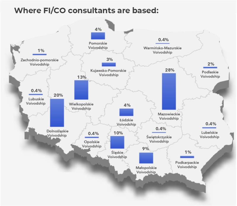 Most FI/CO consultants work in the provinces of Mazovia (28%) and Lower Silesia (20%), followed by Greater Poland, Silesia and Lesser Poland. This distribution is not accidental – it is in these regions that the largest number of consulting companies and SAP service centres are located, and in the west of the country there are also many manufacturing companies that make intensive use of SAP solutions, especially in the area of finance and controlling.