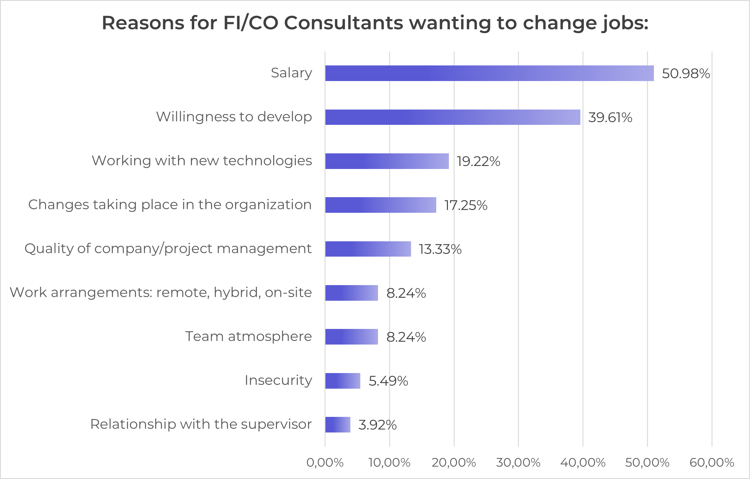 The most frequently cited reasons for changing jobs are remuneration (51%) and the desire for professional development (40%). FI/CO consultants are eager to get involved in new implementations, especially projects based on SAP S/4HANA, cloud solutions and international initiatives. They are attracted to tasks that require a broad view of the system and a real impact on the shape of business processes. Development and implementation projects are much more attractive to them than maintenance work, which offers fewer opportunities for competence development.