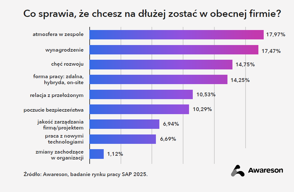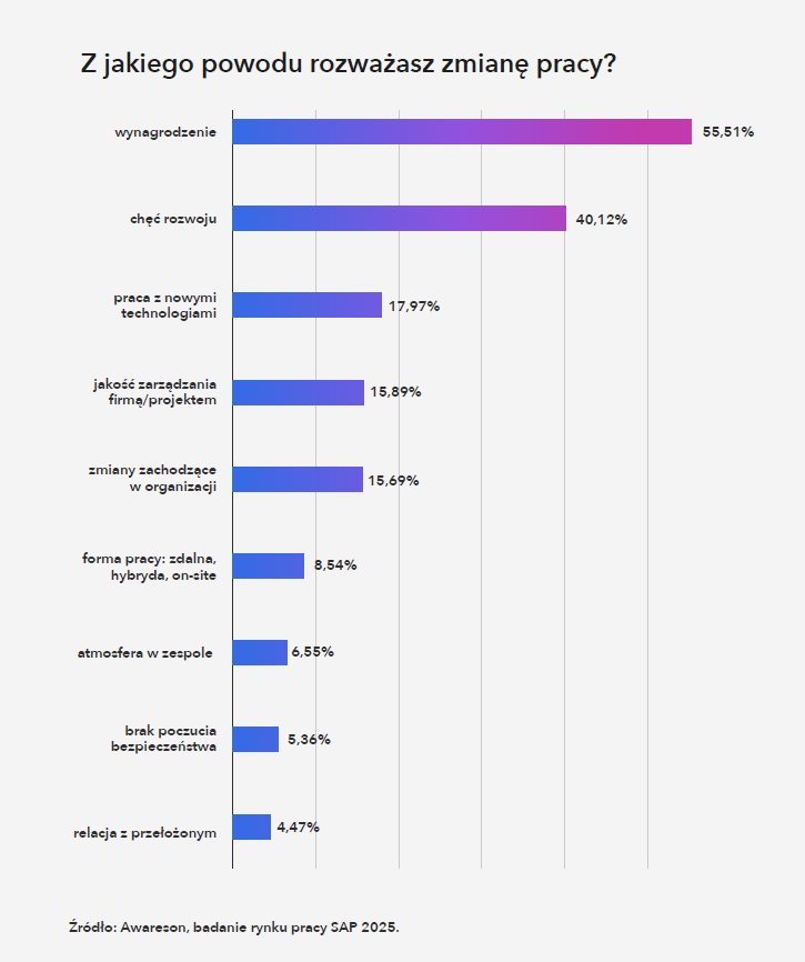 Najczęstszym powodem zmiany pracy jest wynagrodzenie (55,5%) oraz chęć rozwoju (40%). Z kolei to, co zatrzymuje specjalistów w organizacji, to przede wszystkim dobra atmosfera, wynagrodzenie i możliwość podnoszenia kompetencji. Projekty S/4HANA – szczególnie pełne wdrożenia i migracje – mogą być odpowiedzią na te potrzeby, jeśli tylko dają realny wpływ na rozwiązania i ścieżkę dalszego rozwoju.