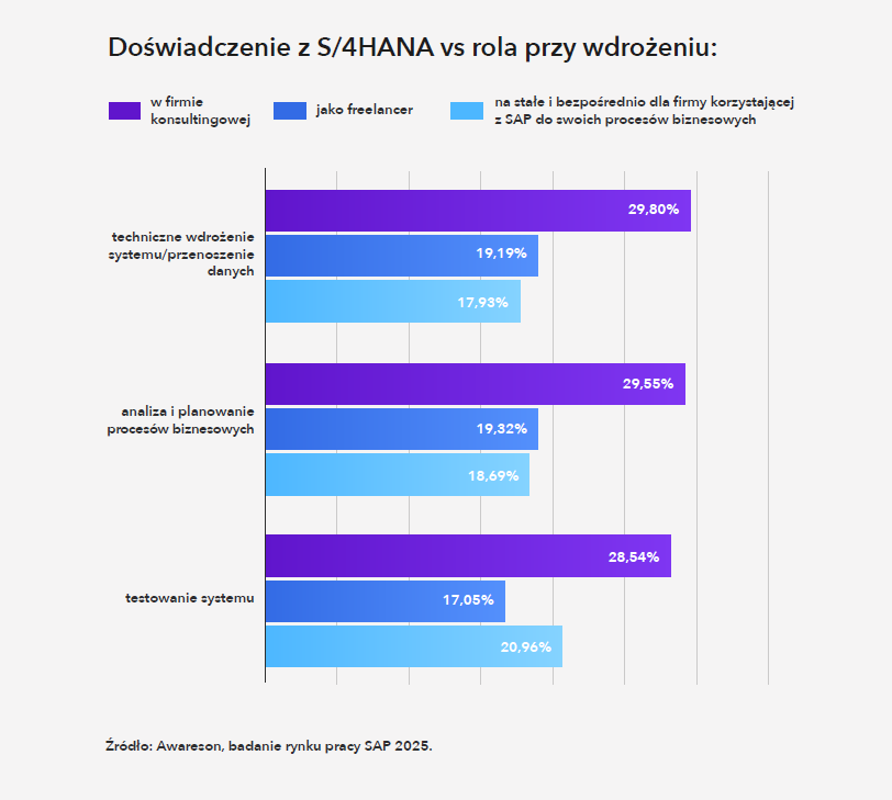 Najwięcej kompetencji z obszaru S/4HANA mają konsultanci pracujący projektowo – freelancerzy i specjaliści związani z firmami doradczymi. Osoby zatrudnione bezpośrednio przez klientów końcowych również mają udział w projektach, choć najczęściej ograniczony do konkretnych faz.