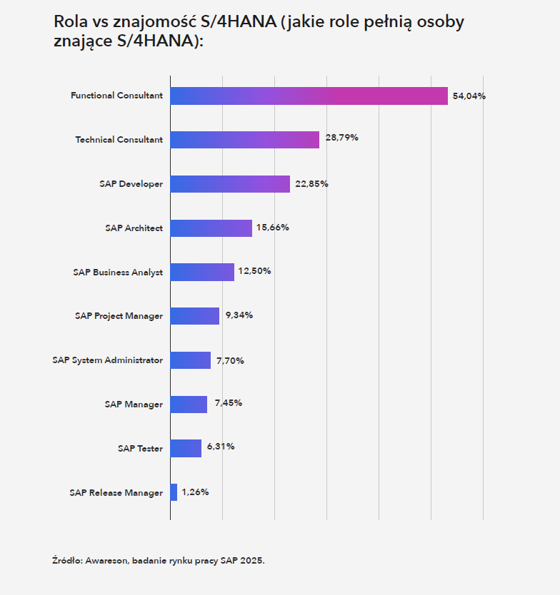 Wśród wszystkich osób znających S/4HANA najwięcej pracuje w rolach funkcjonalnych (54%) i technicznych (28,8%). Dalej plasują się deweloperzy (22,9%) i architekci (15,7%). To nie zaskakuje – właśnie te cztery grupy są najliczniej reprezentowane w społeczności SAP, a zarazem najczęściej angażowane w projekty migracyjne i wdrożeniowe.