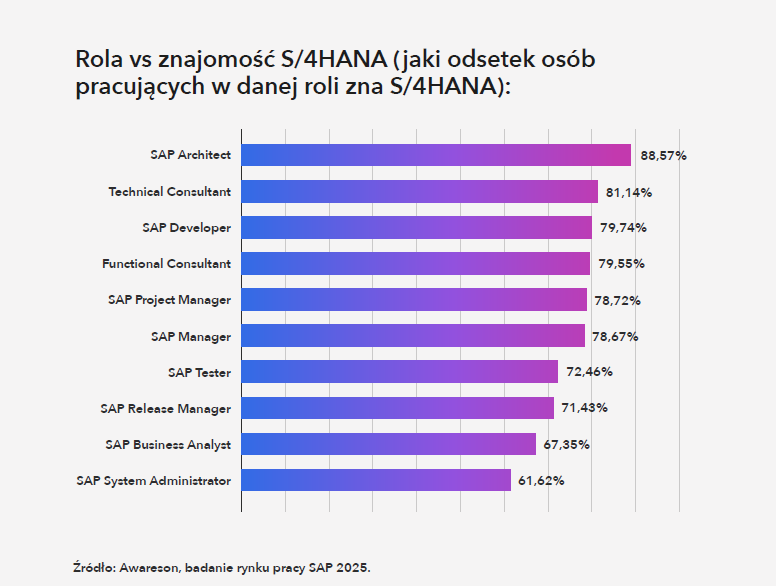 Najwyższe wskaźniki znajomości S/4HANA mają architekci SAP (88,6%), konsultanci techniczni (81,1%) i deweloperzy (79,7%). W ich przypadku wiedza o nowej wersji wynika z charakteru pracy – projektują rozwiązania, tworzą rozszerzenia, integrują systemy. Znajomość S/4HANA jest dla nich warunkiem skutecznego działania.
