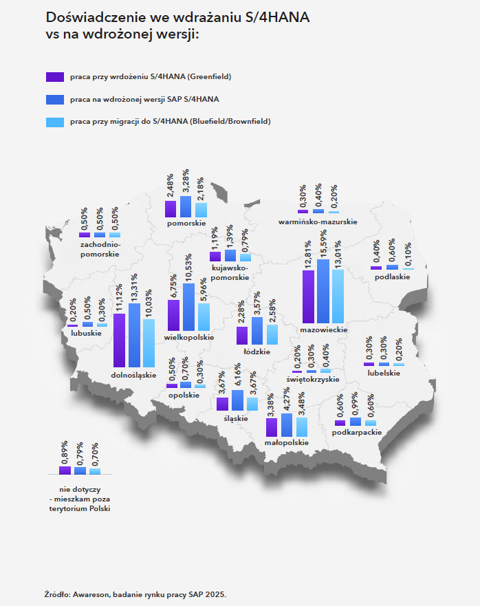 Zdecydowana większość specjalistów SAP mieszka w województwach mazowieckim, dolnośląskim i wielkopolskim – to tam skoncentrowana jest infrastruktura wdrożeniowa i kliencka. I to tam naturalnie znajdziemy najwięcej osób znających S/4HANA. To istotna wskazówka przy planowaniu projektu, w którym wymagana jest obecność z biurze, szczególnie jeśli wiąże się on z pracą w zakładach produkcyjnych czy testami on-site.