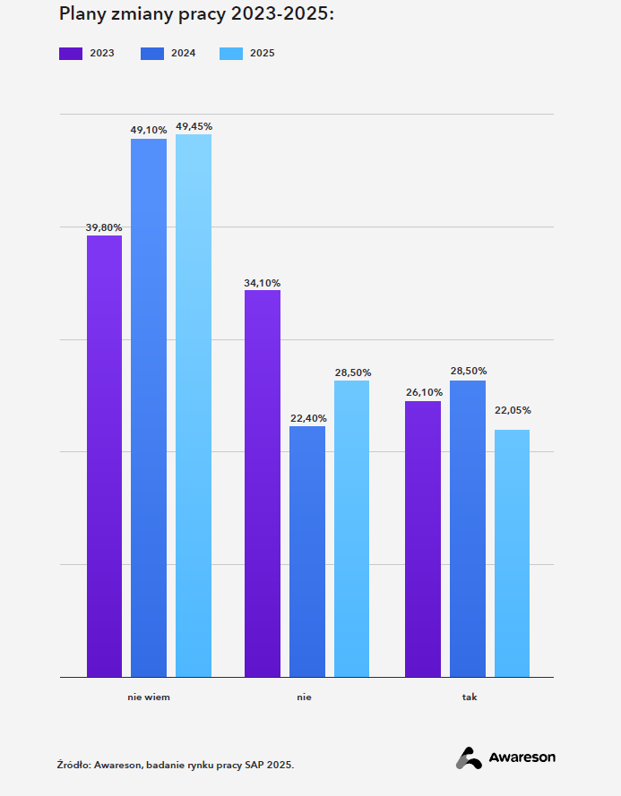 Rozbudowując zespół wewnętrzny o specjalistów zatrudnionych na stałe (czy to na UoP czy wewnętrzne B2B), trzeba uwzględnić wyjątkowo niską rotację wśród specjalistów SAP. Tylko 22% deklaruje, że planuje zmianę pracy. To wynik wyraźnie niższy niż średnia w branży IT, gdzie rotacja przekracza 30%. Dla porównania – według danych Gallupa o zmianie pracy myśli 52% pracowników na świecie i 31% w Europie.
