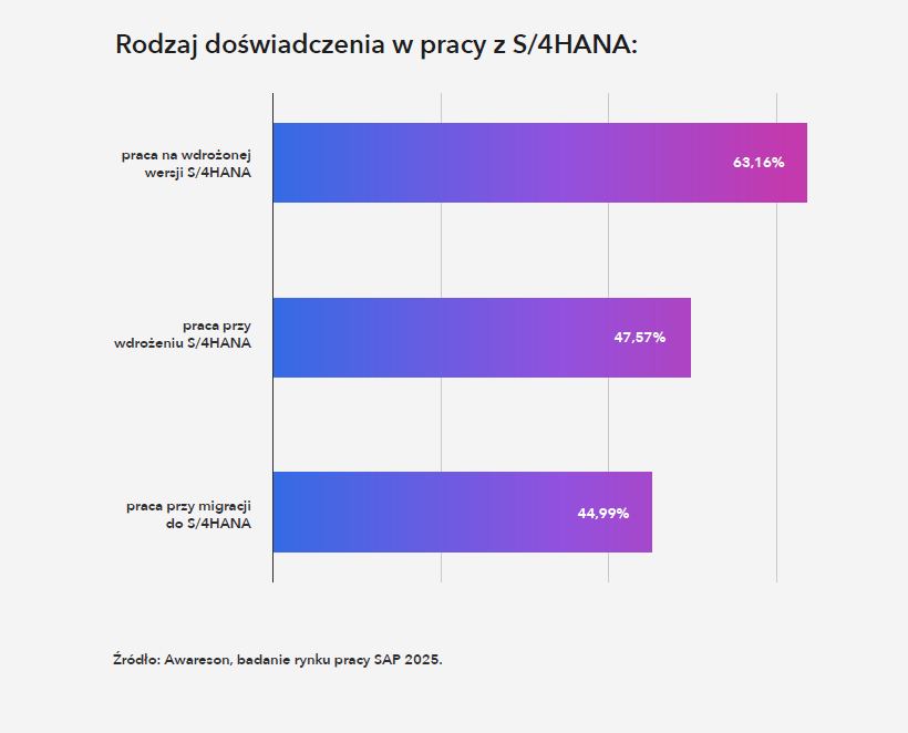 To jednak bardzo różny poziom znajomości – od szkoleń i certyfikatów po pełne projekty migracyjne. Najwięcej osób deklaruje doświadczenie w pracy na już wdrożonej wersji S/4HANA (63%). Oznacza to, że znaczna część specjalistów zna system głównie z perspektywy operacyjnej – utrzymania procesów, wsparcia użytkowników i rozwoju. Mniej osób brało udział w projektach wdrożeniowych (47,6%) lub migracjach (45%).