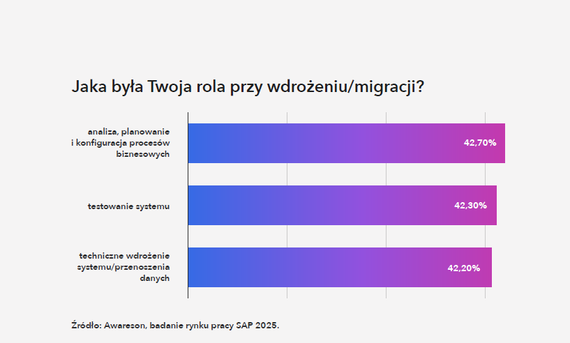 Jeśli spojrzeć na role pełnione przy wdrożeniach i migracjach, rozkład odpowiedzi pokazuje spójny profil kompetencyjny. Najwięcej osób angażowało się w analizę i konfigurację procesów biznesowych (42,7%), testowanie rozwiązań (42,3%) oraz działania techniczne – wdrożenie i migrację danych (42,2%).