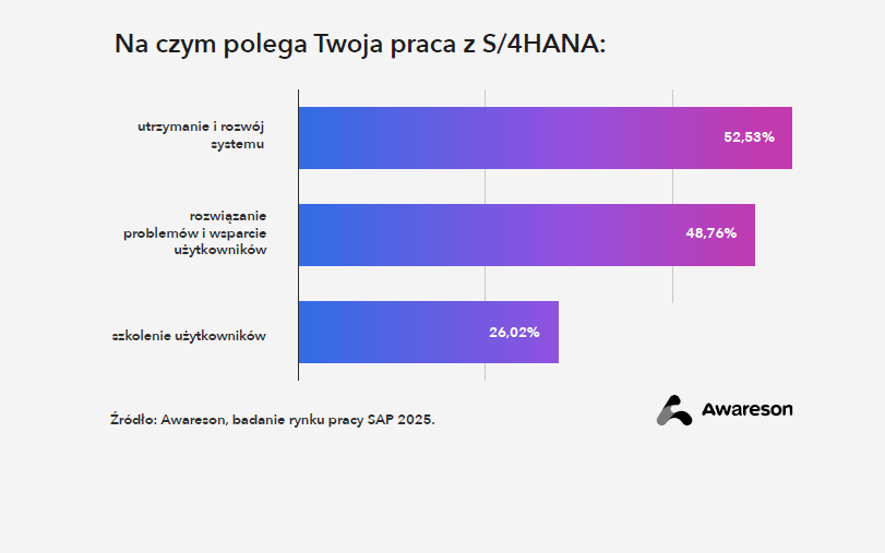 Na co dzień specjaliści SAP najczęściej zajmują się utrzymaniem i rozwojem systemu (52,5%) oraz wsparciem użytkowników (48,8%).