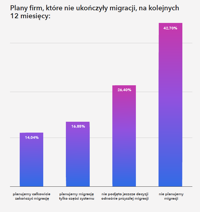 Co ważne, wśród organizacji, które nie ukończyły jeszcze migracji blisko 43% deklaruje, że nie planuje przejścia na nową wersję, a jedna czwarta nie podjęła decyzji, w jakim kierunku pójdzie.