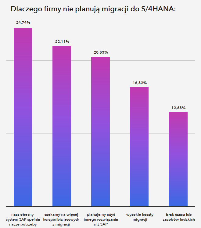 Firmy, które nie planują migracji, najczęściej tłumaczą decyzję tym, że obecny system działa stabilnie, a proponowane przez SAP korzyści z nowej wersji są – ich zdaniem – niewystarczająco przekonujące z perspektywy biznesowej. Wielu badanych przez Awareson menedżerów wskazuje, że nie widzi realnej wartości dodanej z wdrożenia S/4HANA – dominuje obawa przed wysokimi kosztami, brakiem zasobów i przeciążeniem operacyjnym. Jednocześnie część organizacji postrzega zmianę modelu wsparcia przez SAP jako presję do transformacji, nie zawsze opartą na ich wewnętrznych potrzebach, co dodatkowo wstrzymuje decyzję o migracji.