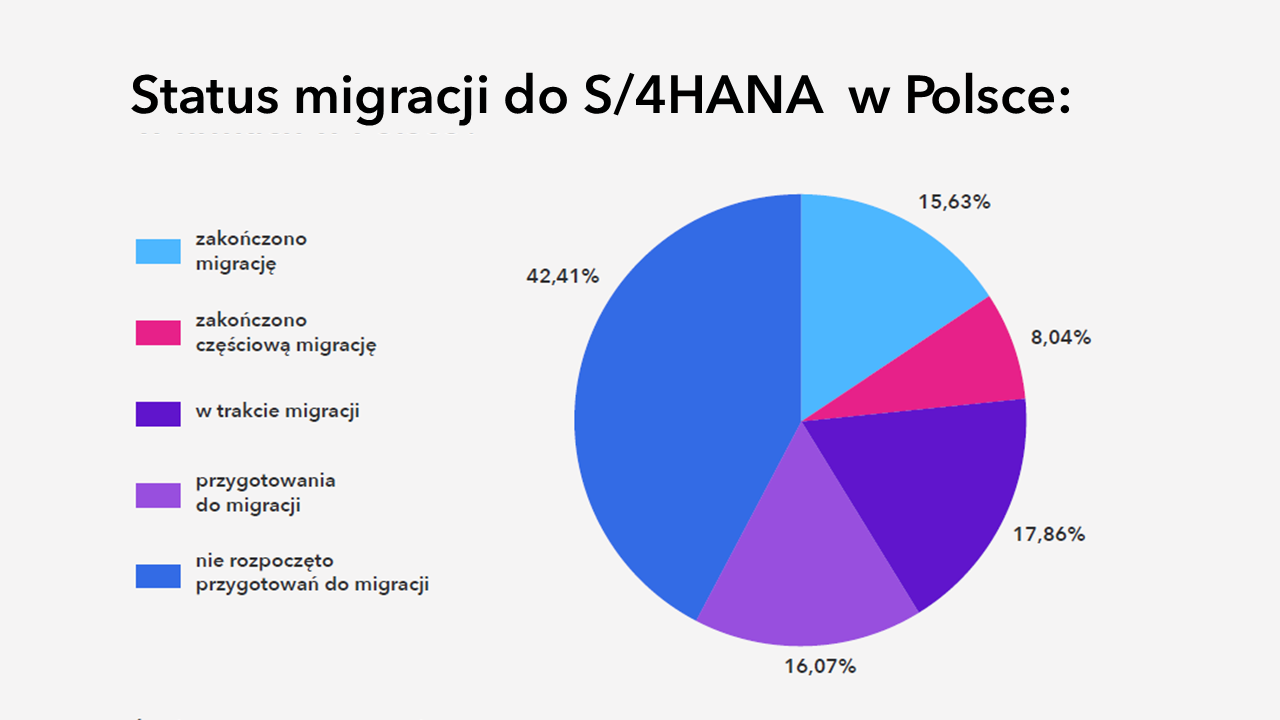 Mimo, że SAP ogłosił decyzję o rychłym zakończeniu wspierania ECC już w 2020 roku, blisko połowa organizacji nie rozpoczęła jeszcze żadnych realnych działań. Tylko co szósta firma zakończyła migrację, a część przedsiębiorstw zrealizowała jedynie wybrane etapy – np. fazę przygotowawczą lub pilotażowe wdrożenia. To oznacza, że zdecydowana większość rynku dopiero stanie przed właściwym wyzwaniem transformacji.